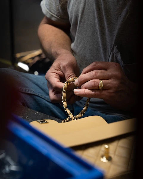 This beautiful quilted Chanel bag needed a strap repair. Our master Artisan, Jim Strong, was able to replace this leather piece by carefully matching the dye hues, resewing the cord and then carefully weaving it through the Chanel chain.